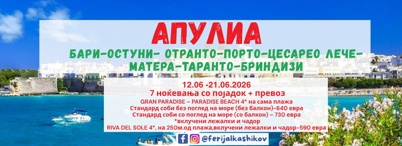 АПУЛИА – ЛЕТО 2026 БАРИ-ОСТУНИ- ОТРАНТО-ПОРТО ЦЕСАРЕО-ЛЕЧЕ-МАТЕРА-ТАРАНТО-БРИНДИЗИ