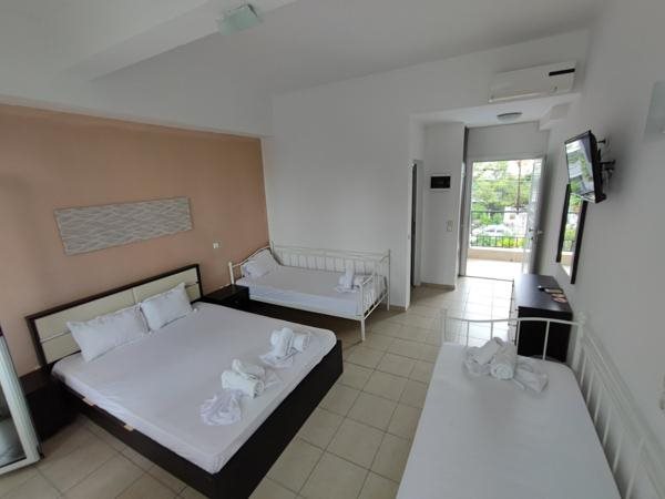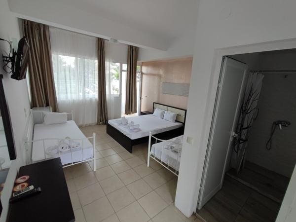 Хотелот е на услуга ПОЛУПАНСИОН и располага со 47 соби: 1/3 Приземје собите се наоѓаат на приземје и имаат ограничен поглед (брачен + eдинечен кревет), 1/3 Стандард собите се наоѓаат на кат и имаат страничен или директен поглед кон море (брачен + единечен кревет), 1/4 Студио собите се наоѓаат на кат со поглед на море или базен (брачен + 2 единечни кревети во иста соба) , 1/4 Апартман собите се со страничен или директен поглед кон море (брачен + 2 единечни кревети во различна соба) и 1/5 Апартман со директен поглед кон море (брачен + 1 единечен и 2 единечни кревети во различна соба) . Секоја соба има простран балкон и е опремена со: фрижидер, клима уред (вклучен во цената), Wi-Fi, сат. ТВ, тоалет, пешкири, средства за лична хигиена и сушара. Хотелот има главен ресторан, базен со чадори и лежалки, бар покрај базенот, детско катче со трамболина, лизгалки и други реквизити, сопствена плажа и бар на плажа кој е со доплата.