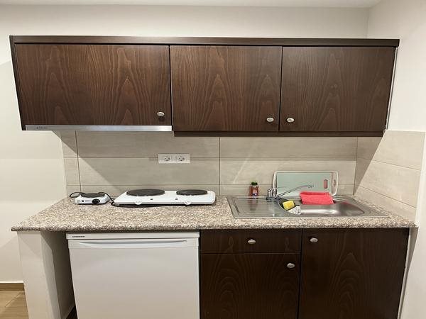 Сите студија се на приземје и опремени со кујна со мини фрижидер, решо со две рингли, висечки елемент над кујна и под кујна и се опремени со LCD TV и клима, маса и столчиња, ( соодветно на бројот на кревети). Прозорот е од балконската врата, нема комарник, но има ролетна, тенда и завеса. Тоалетот е со туш директно на плочки, вентилација или прозор во самиот тоалет.